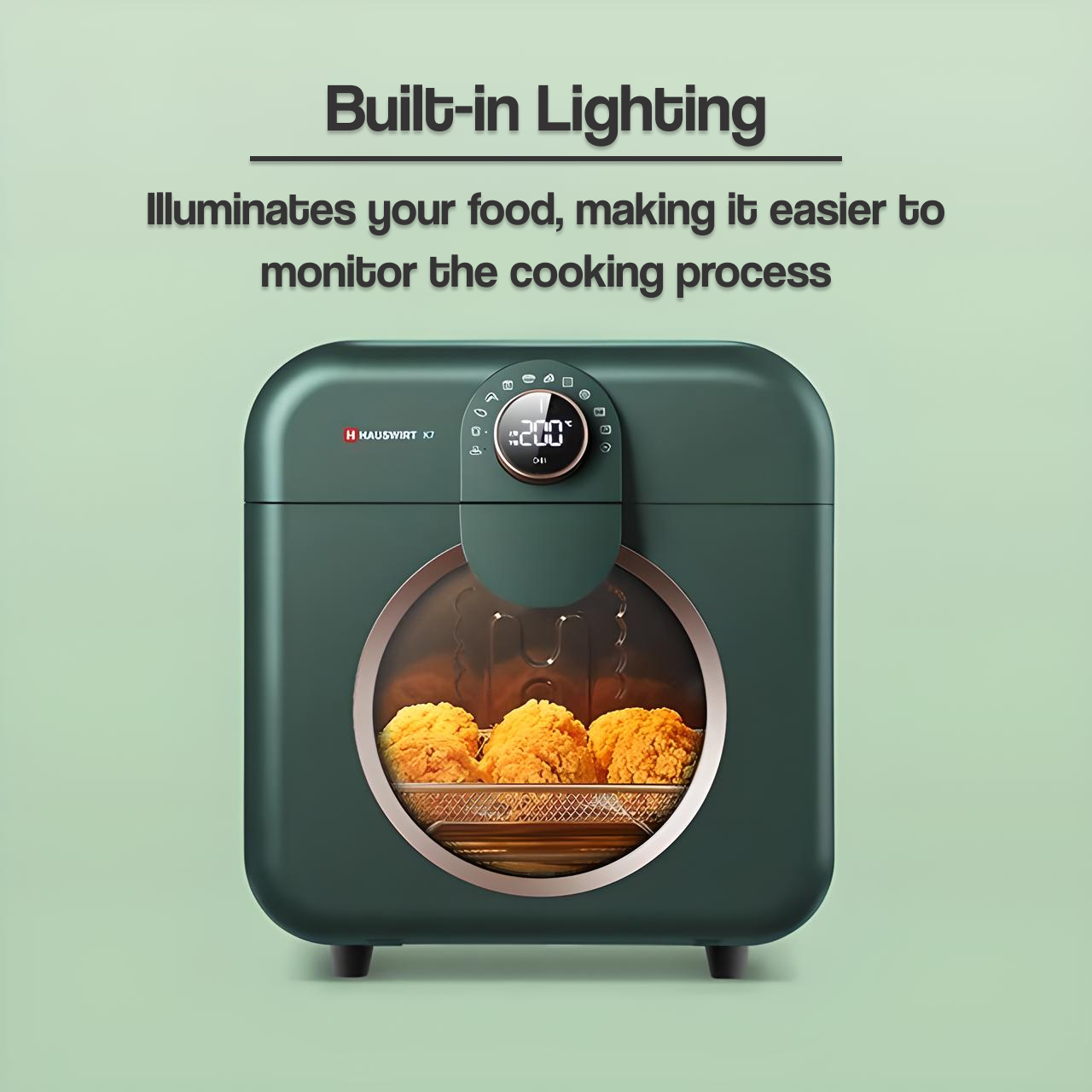 This cooker may look small and pretty on the outside, but it's incredibly spacious on the inside. It's equipped with four heating elements and an enamel interior, providing amazing cooking abilities. Despite its compact appearance, it can easily handle baking an 8-inch chiffon cake or a 450g loaf of bread. Plus, it comes with 12 preset functions, making it as versatile as an oven, air fryer, dehydrator, yogurt maker, and bread machine all in one. Overall, I'm really happy with how this air fryer works. The only thing I noticed is that the light inside the oven doesn't stay on all the time. This seems to be a design choice to save energy, which makes sense since you don't really need to watch your food constantly. Personally, I prefer having the light on, but I understand that's a matter of preference and doesn't take away from the cooker's performance.