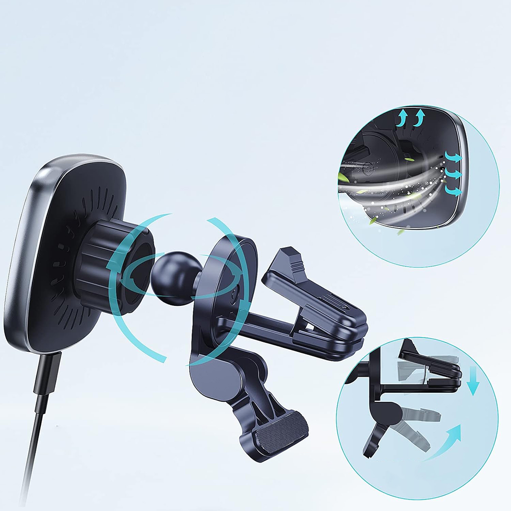 The versatility of this product is outstanding. Whether using the vent clip or the dashboard option, my phone has never felt more secure. The additional cooling feature ensures my phone is always at an optimal temperature. The efficiency of this holder is unmatched. The magnetic attachment is secure, and the cooling fan ensures my phone stays cool. The USB Type C connector for fast charging is just what I needed. Highly satisfied with my purchase.