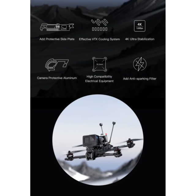 The custom protective side plate provides an additional layer of assurance, allowing me to fly with peace of mind. With the integration of VTX cooling fins, this quadcopter maintains its composure even during extensive flights, ensuring uninterrupted performance.