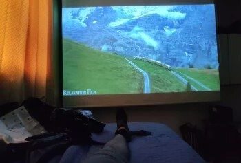 The screen quality holds up pretty well with the lights on, which is cool. You can get apps like Twitch on it to keep up with streams and movies. Projecting on the ceiling is hands down the best thing about it.