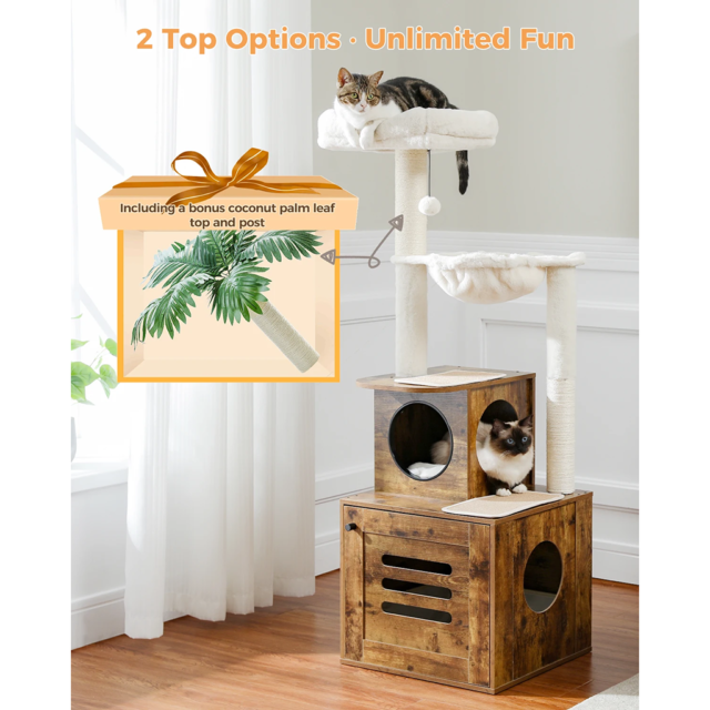 Our product stands out for its thoughtful design and superior quality. It combines a spacious cabinet large enough for a comfortable sleep or to discreetly house a litter box, a foldable litter box included for convenience, and multiple scratching posts wrapped in natural sisal rope for your cat’s scratching needs. The tree also features two top options, including a coconut palm leaf top, and a variety of lounging spots like a large-space top perch and a capacious hammock. Crafted from healthy and eco-friendly materials, it ensures your cat’s well-being while adding a stylish touch to your home decor.