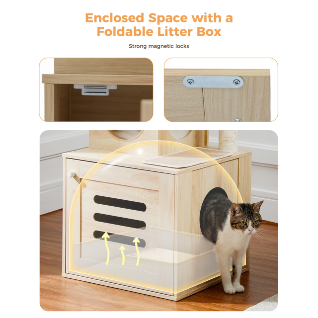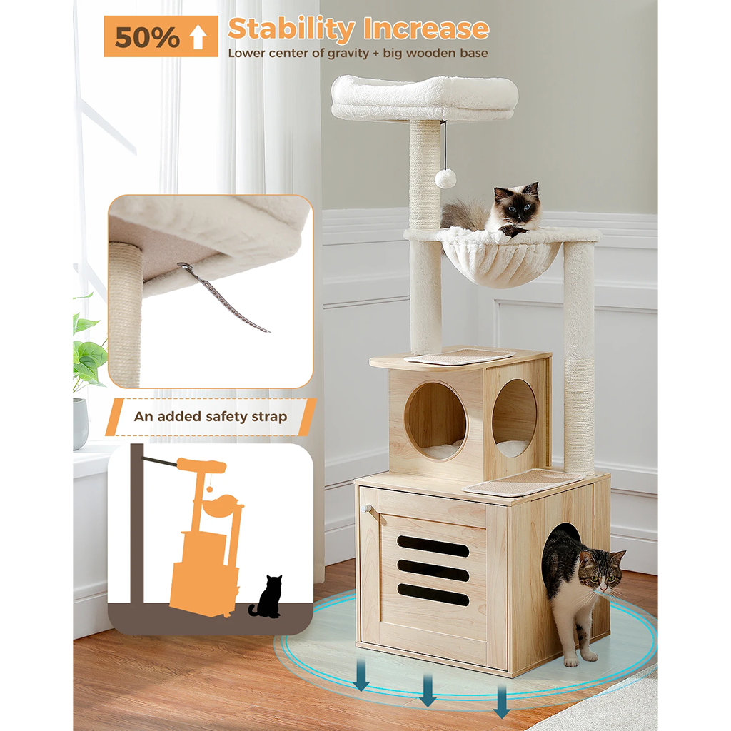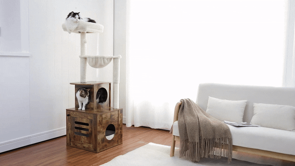 This cat tree has become the main attraction for my cats, offering them endless entertainment and comfort. The incorporation of the litter box into the design is ingenious, addressing the common issue of unsightly litter trays. The quality of craftsmanship ensures stability, and the plush materials invite my cats to spend hours lounging. Assembly was a breeze, with each component engineered for a perfect fit. It's not just furniture; it's a significant upgrade to my cats' lifestyle.