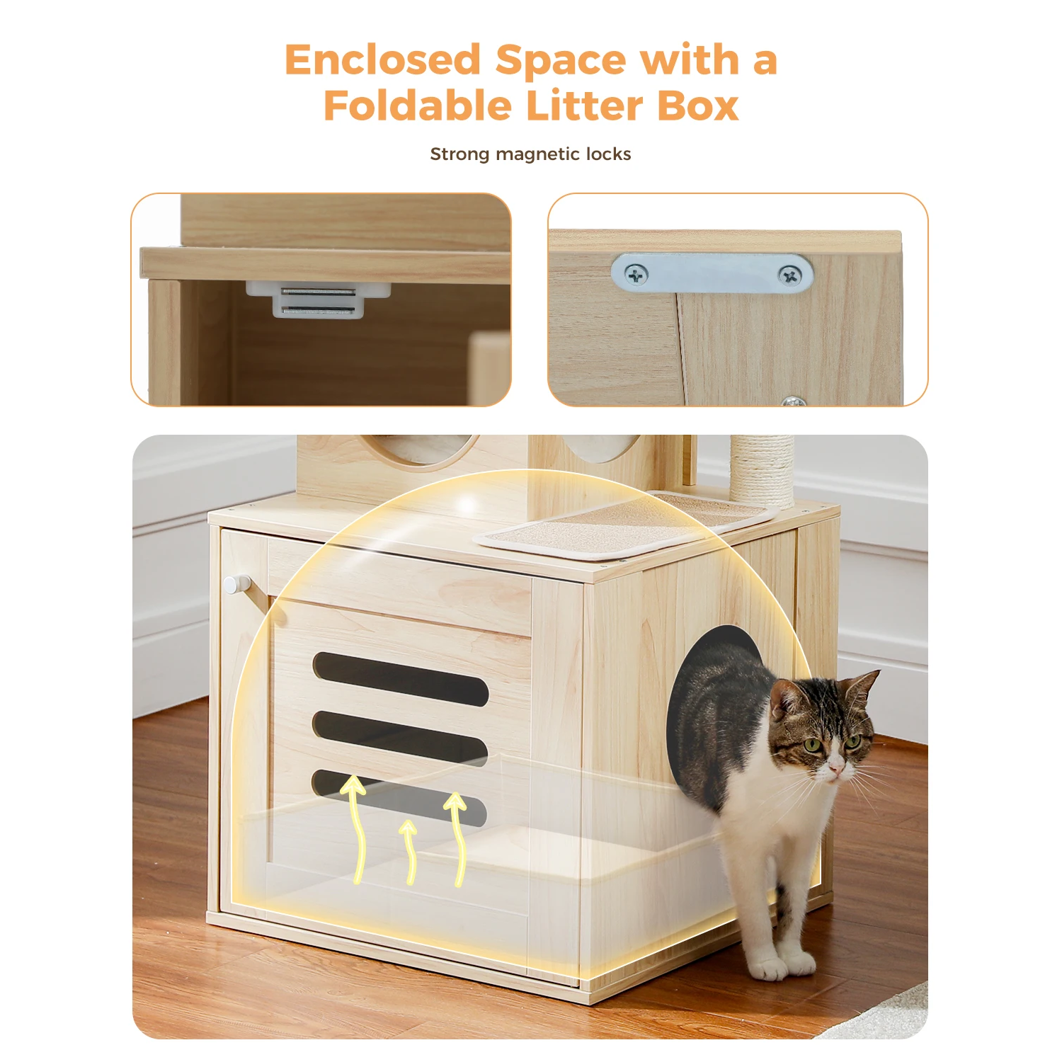 The upper part where the cats can hang out is top-notch—they can't get enough of the hammock and the cushy bed. The whole unit feels stable thanks to the enclosed base. Being able to swing open the doors, whip out the litter box for a quick clean, and slot it back in effortlessly is a game-changer. It's sleek, made from quality materials, and doesn't stick out like a sore thumb in the room. Plus, the inclusion of a foldable litter box is a neat little perk.