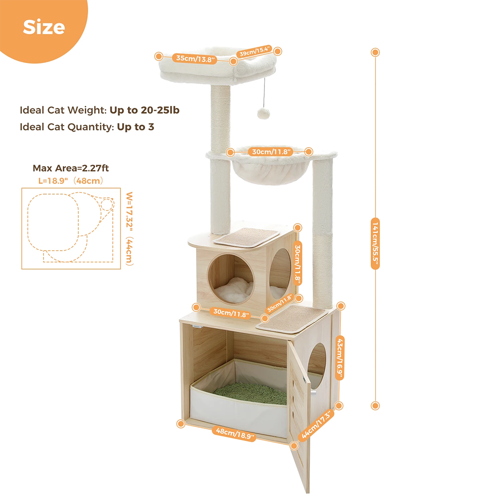 Absolutely thrilled with this purchase. The cat tree not only offers my cat a luxurious spot to relax and play, but it also smartly conceals the litter box, keeping the living area looking neat and smelling fresh. The assembly was hassle-free, with every piece fitting perfectly. It’s sturdy, functional, and aesthetically pleasing, making it a favorite for both my cat and me.