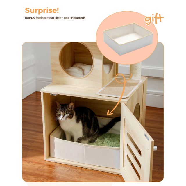 It's absolutely adorable!! Seriously, finding a cat tree that doesn't make me cringe has been a mission, but this one's a showstopper. My cats are obsessed with the top part, and you can even swap it out. Clearly, a cat person thought this up, and I'm all for it 😍 So happy with my buy! The built-in spot for the litter box is genius. Heads up though: a standard litter box won't fit, you've gotta use the kinda flimsy one it comes with. I threw in a wooden panel at the bottom for extra support and lined it with kitty litter liners - works like a charm.