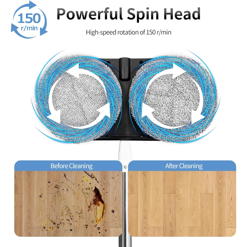 This spin mop is a cleaning game-changer. The dual spinning heads clean at an impressive speed, and the battery lasts long enough to mop my entire house. The water spray function is a neat feature, and the head-light is surprisingly useful for dark corners.