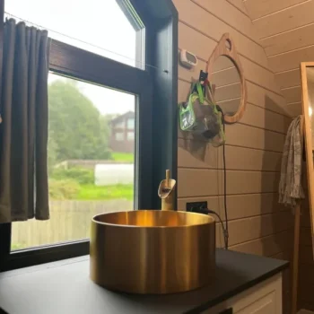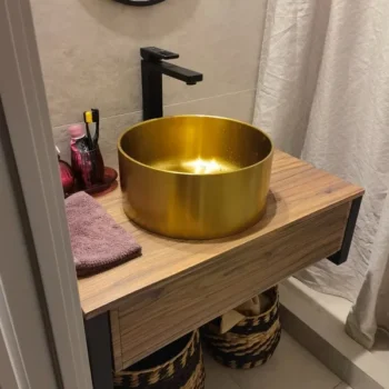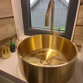 This gold basin is an ideal fit for our new tiny house bathroom, matching our decor perfectly. Made from strong metal and reasonably priced, I highly recommend it for those who love the gold aesthetic.