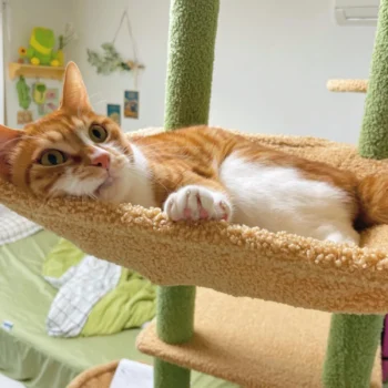 This cat tree is a climber's paradise! My hefty 16-pound cat lounging comfortably in the hammock – a perfect fit! Highly recommended for your feline friends who love to scale new heights.