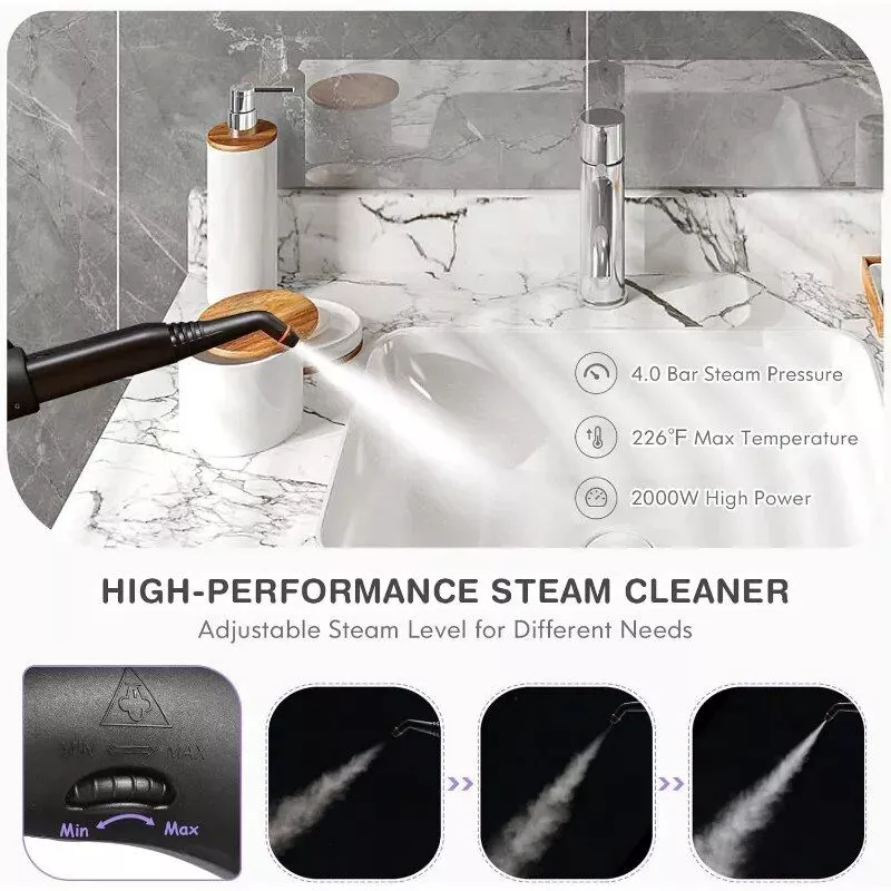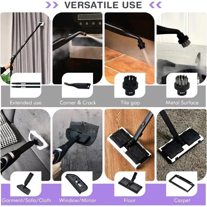 With 19 diverse accessories, this steam cleaner adapts to your every need. Clean floors, windows, cars, and more with tools like the glove, measuring cup, extension tubes, and various brushes. Its compact, modern design fits seamlessly into any space, boasting a lightweight form factor for easy handling.