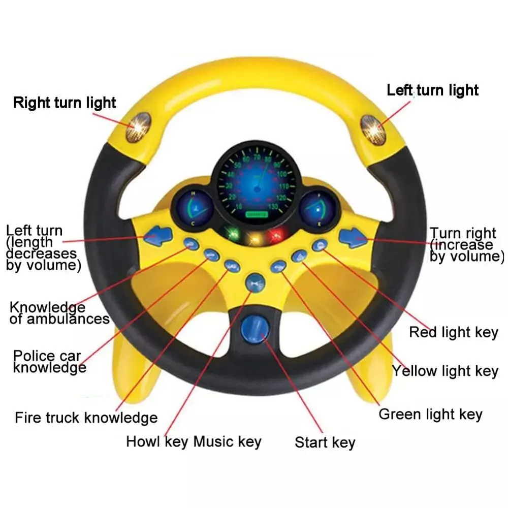 Introduce your child to the exciting world of driving with our Interactive Steering Wheel Toy! Packed with realistic sounds, vibrant lights, and a range of educational features, this three-dimensional portable wheel is the perfect co-pilot toy for your little one. Watch as they engage in imaginative play, develop essential skills, and have a blast all at the same time!