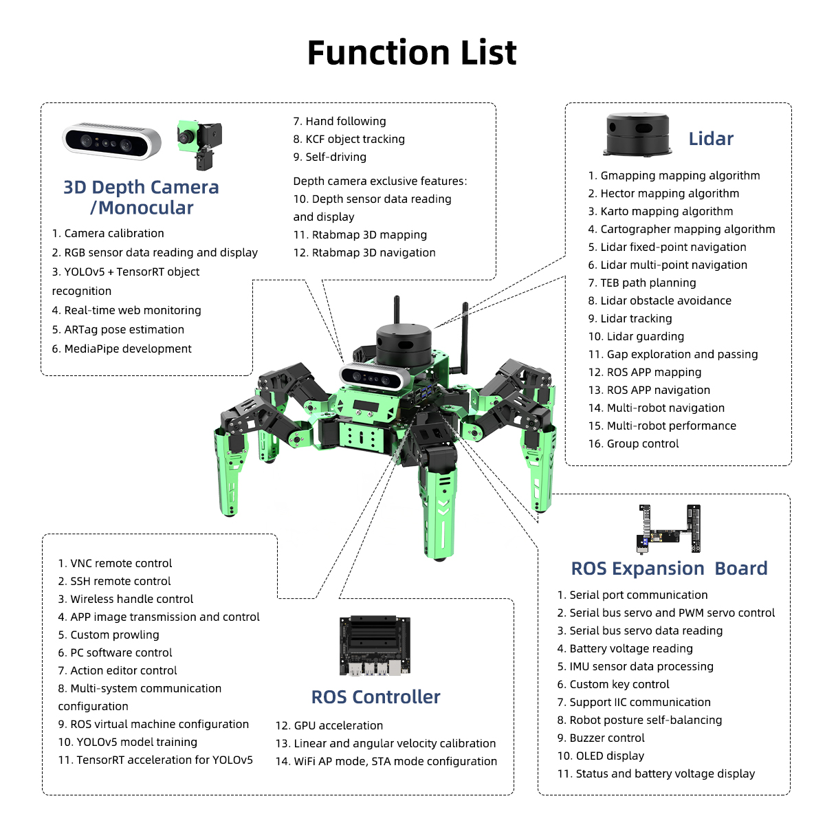 Embarking on robotics projects can be daunting, especially when you’re looking for a kit that strikes the perfect balance between quality, functionality, and affordability. The JetHexa robot kit is a standout in this regard, boasting a robustness and a suite of features that belie its price point. From the moment you lift it, the weight of the JetHexa reassures you of its quality - not cumbersome, but indicative of the solid, full-metal hard aluminum alloy construction that promises and delivers durability. The potential applications of these features are vast, from creating robots that can assist in home automation to developing systems that can aid in the exploration of hazardous environments without putting human lives at risk. The JetHexa doesn't just offer a glimpse into the future of robotics; it provides the tools and the platform to actively participate in shaping that future. Beyond its technical capabilities, the JetHexa is also designed with the user in mind. Its lightweight yet durable construction makes it ideal for both indoor and outdoor projects. The advanced mobility, with 18 degrees of freedom, allows it to navigate through complex terrains with ease, offering a practical demonstration of theoretical concepts in robotics and engineering. For anyone serious about robotics, the JetHexa is not just a purchase; it's an investment in your development as a robotics engineer or hobbyist. It's a platform that challenges you to push the boundaries of what you believe is possible, offering a blend of robust construction, advanced technological integration, and user-friendly design that is rare to find in the market. Whether you're looking to embark on sophisticated AI projects or simply passionate about exploring the potential of robotics, the JetHexa kit stands ready to turn your visions into reality.
