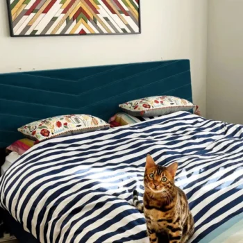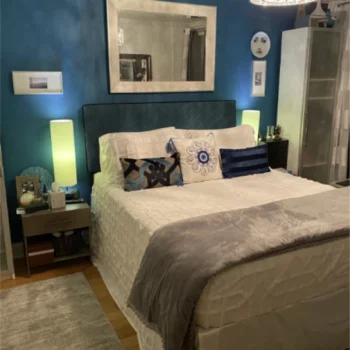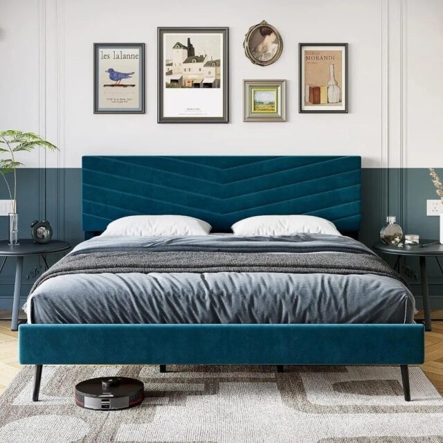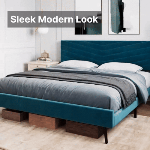 Experience the ultimate in customization and comfort with our adjustable headboard. Offering three height settings, it caters to your unique comfort needs, whether you enjoy reading in bed or watching TV. The plush upholstered headboard, measuring 76.4″L x 81.9″W x 42.5″H, is not just a statement of style but also a promise of comfort. Our bed frame’s sleek, modern design, accentuated by its stunning blue color and wood finish, effortlessly complements any bedroom decor. Its appearance embodies modern style, Scandinavian simplicity, and a hint of modern Morocco, making it a versatile addition to any interior design theme.