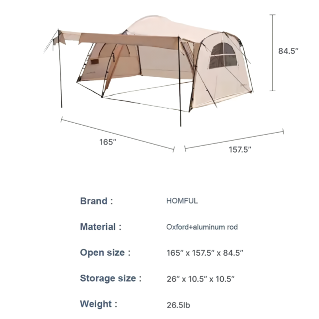 This tent redefines camping with its luxurious space and robust construction. The premium Oxford fabric and reflective Mylar make it comfortable in any weather, while the durable steel poles ensure stability. Its spacious interior, with separate living and sleeping areas, accommodates our family comfortably, providing a serene retreat in nature. Truly the best blend of nature and comfort!
