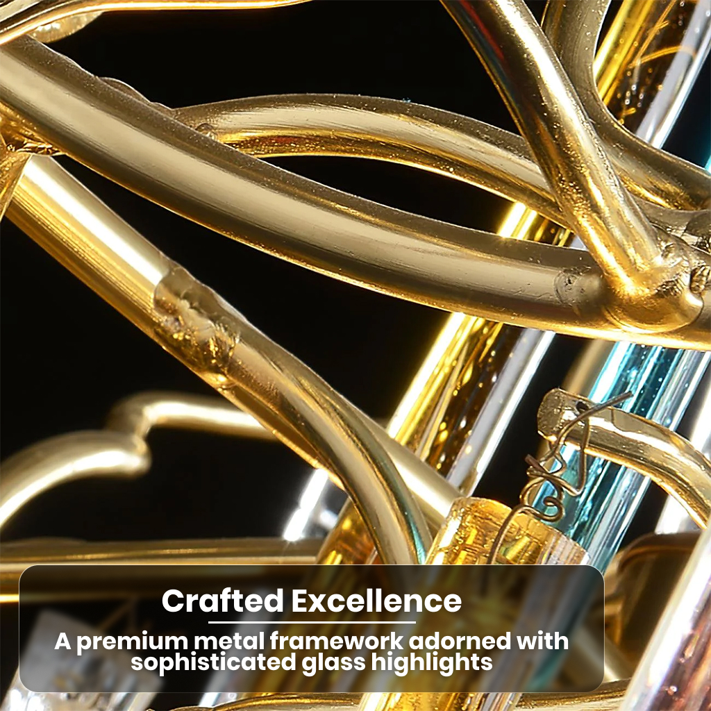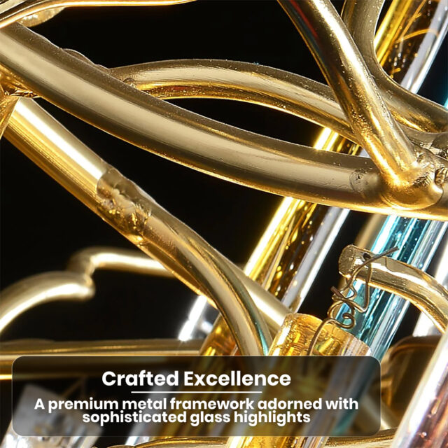Illuminate your home with the radiance of our Luxurious Glass Drop LED Chandelier, a masterpiece designed to blend modern sophistication with timeless elegance. This exquisite lighting fixture is perfect for those seeking to add a touch of luxury and contemporary design to their living space. Crafted from high-quality metal and glass, our chandelier is available in a stunning gold option complemented by either clear or multicolored glass drops. Whether it’s for your dining room, living room, or any other space, this chandelier promises to transform your decor.