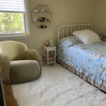 Found the ultimate fluffy chair for my bedroom! Wasn't sure about getting it in off white because of my cat, but the green looks awesome against my dark grey walls. Need to work out the cat situation though! It's taking the place of an old rocker I barely used anymore. Perfect spot for reading, chilling, or just hanging out.