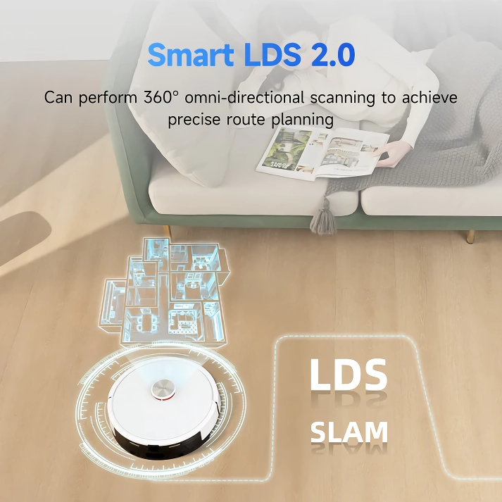 • Smart Navigation: LDS SLAM technology for precise mapping and obstacle avoidance.