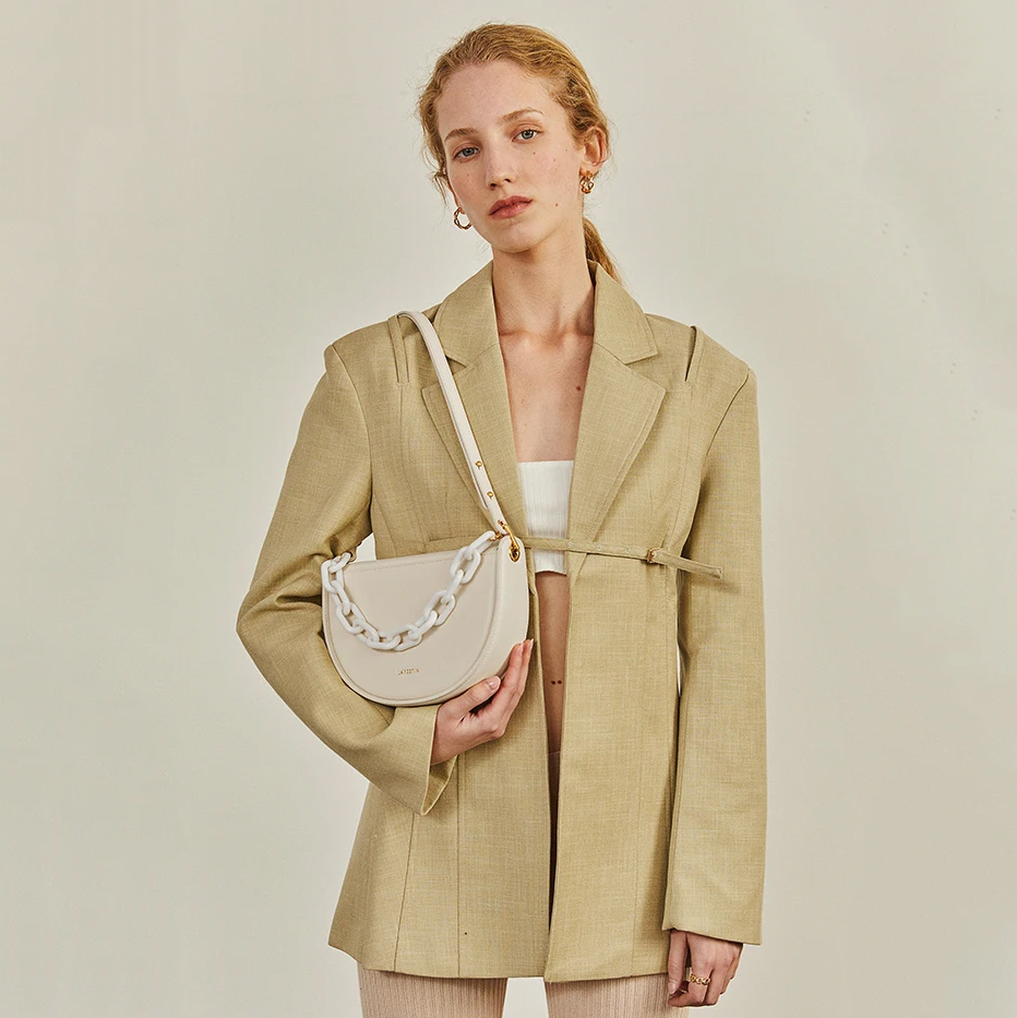 At the heart of its design is a commitment to both aesthetic appeal and practicality. Crafted with high-quality split leather and a durable polyester lining, this purse stands out not just for its beauty but also for its resilience. The unique semi-circle shape, complemented by a chic resin chain decoration, offers a nod to nostalgic elegance while keeping your look modern and fresh.