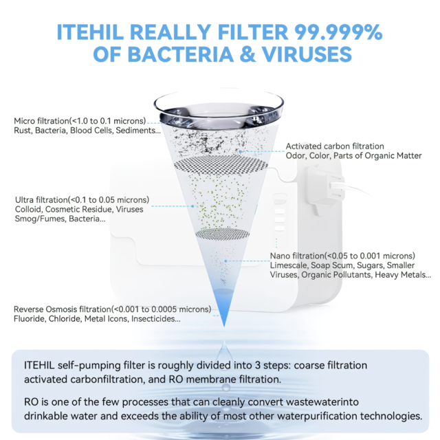 This filter really does the job well, taking out all the tiny particles from the water. I can purify a bunch of gallons on one charge, and the battery lasts way longer than the usual ones, plus it charges up pretty quick. It's light and comes with a handy bag for the cables and stuff. When I had a leak issue, their customer service was on it fast, so check your email carefully for their reply. Just a heads up, it comes with a USB-C to USB-C cable but no plug for the wall, and while it gets rid of the bad stuff in the water, it doesn't adjust the pH much. I just run the purified water through another filter to get the pH right. The instructions could be clearer, especially about how deep to insert the filters and what the charging lights mean. It seems like blinking is for charging, solid is charged, and off means it's been unplugged for a bit, but I'm guessing here. And remember, RO filters take out almost all minerals from the water, so think about adding some back in to stay healthy.