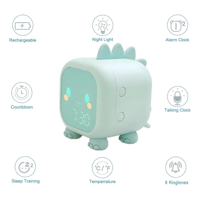 this alarm clock has been a great purchase. the dinosaur design is a hit with my child and the voice control feature makes it easy for them to use. the night light is soft and calming, perfect for helping them fall asleep. the alarm is simple to set and has a pleasant sound that wakes my child without startling them. it’s also very well-made and durable. mornings have become much smoother since we started using this clock. highly recommend to other parents looking for a fun and practical solution.